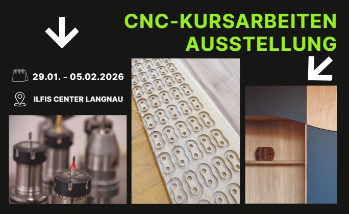 Die Langnauer Schreiner-Klassen 22-26 a/b präsentieren vom 29. Januar bis 5. Februar 2026 im Ilfis Center Langnau ihre CNC-Kursarbeiten. Ein Besuch lohnt sich definitiv!